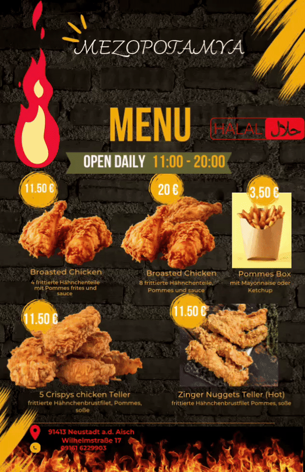 Willkommen bei Mezopotamya in Neustadt an der Aisch! Unser Restaurant bringt Ihnen die authentischen Aromen der orientalischen Küche in einem großzügigen und stilvollen Ambiente näher. Neben klassischen Spezialitäten wie Burger, Falafel, Wraps und Shawarma bieten wir orientalische Köstlichkeiten wie Kebbah, das würzige Reisgericht Mandi und die erfrischende Fatoush-Suppe. Dazu erwartet Sie eine große Auswahl an kalten und warmen Getränken, die jedes Geschmackserlebnis abrunden. Ob für ein entspanntes Mittagessen oder einen genussvollen Abend – Mezopotamya ist der perfekte Ort, um die Vielfalt des Orients zu genießen.